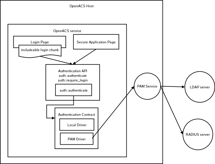 • Authentication API: The API through which login pages and applications talk to the authentication service. There's one and only one implementation of the authentication API, namly the one included in OpenACS Core.