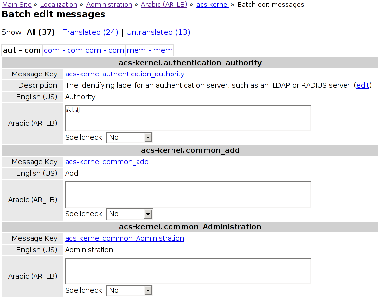 • Batch translation.To translate many messages at once, go to Administration of Localization, click on the locale to translate, then click on a package, and then click Batch edit these messages.